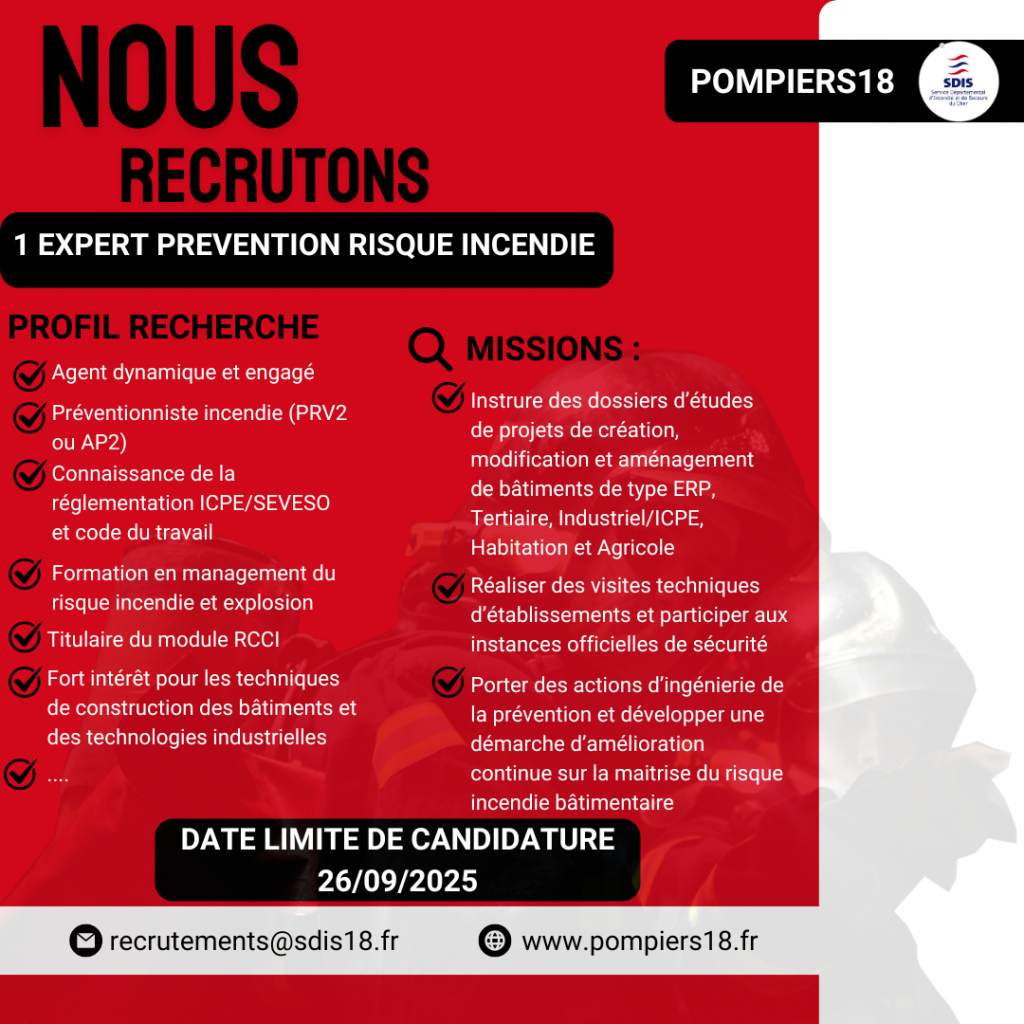 Fiche de poste : https://pompiers18.fr/wp-content/uploads/2025/07/FP-EXPERT-PREVENTION-RISQUE-INCENDIE.pdf