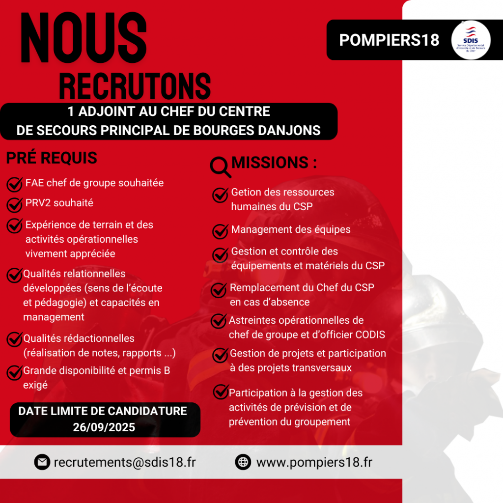 Avis de vacance : https://pompiers18.fr/wp-content/uploads/2025/08/AV-ADJ-CHEF-CSP-BGS-DANJONS.pdf