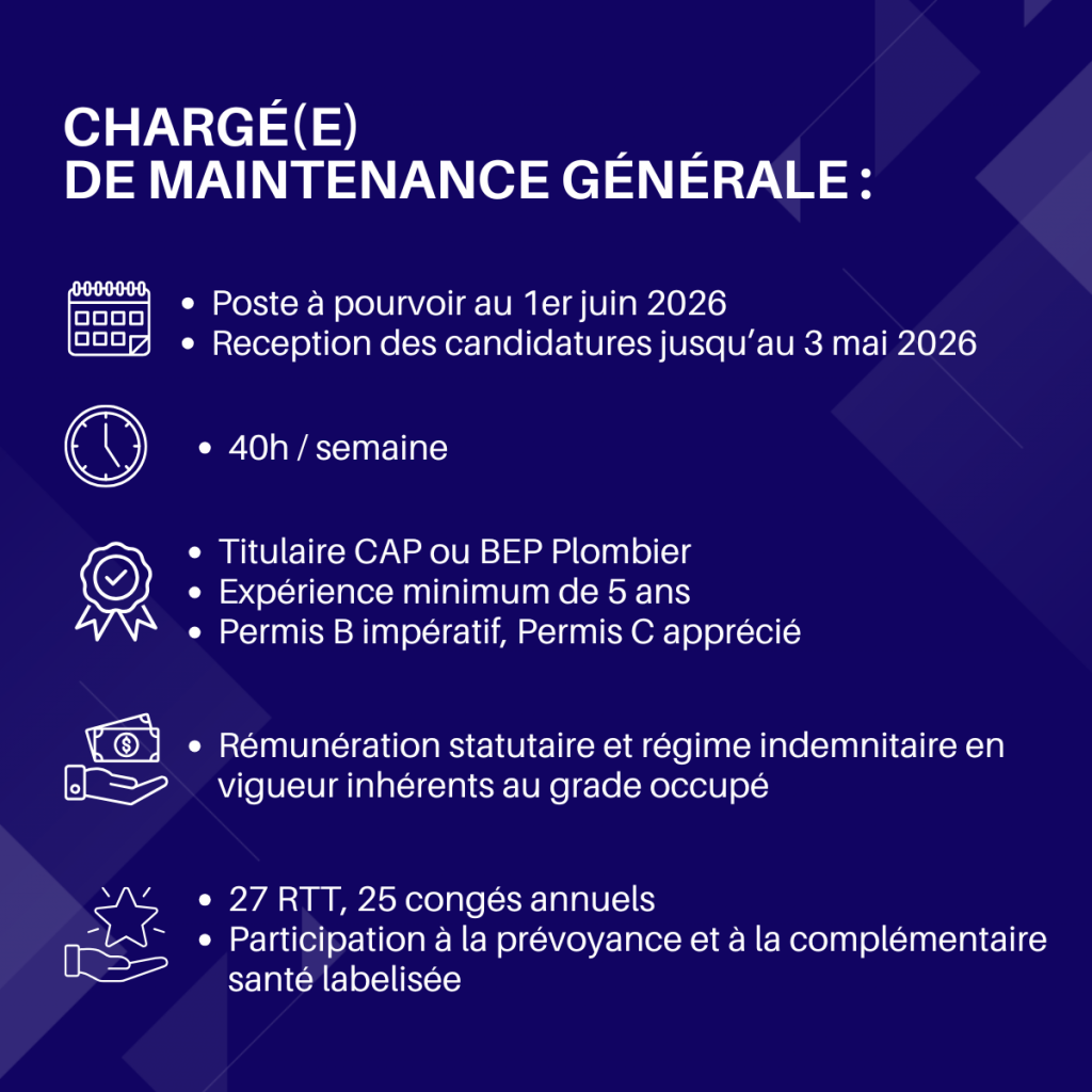 Ce poste, à pourvoir dès le 1er juin 2026, est ouvert aux grades à minima d’adjoint technique jusqu’au grade maximal de technicien de 1ère classe.